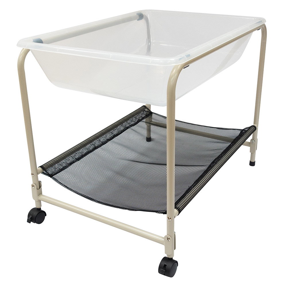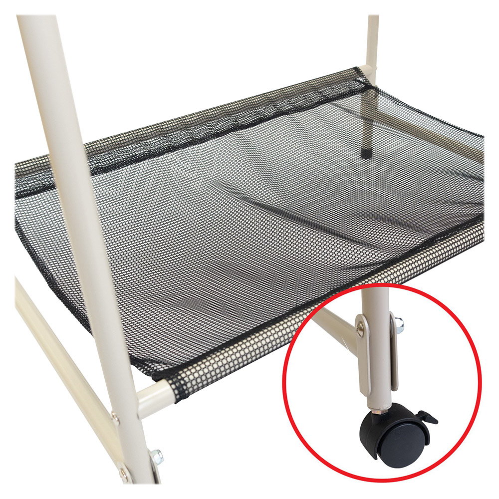 - Az asztal egy erős átlátszó műanyag tálcát és egy erős, cső alakú acélvázat tartalmaz, nylonhálós tárolóállvánnyal és két kerékkel, amelyek lehetővé teszik a könnyű mozgatást.