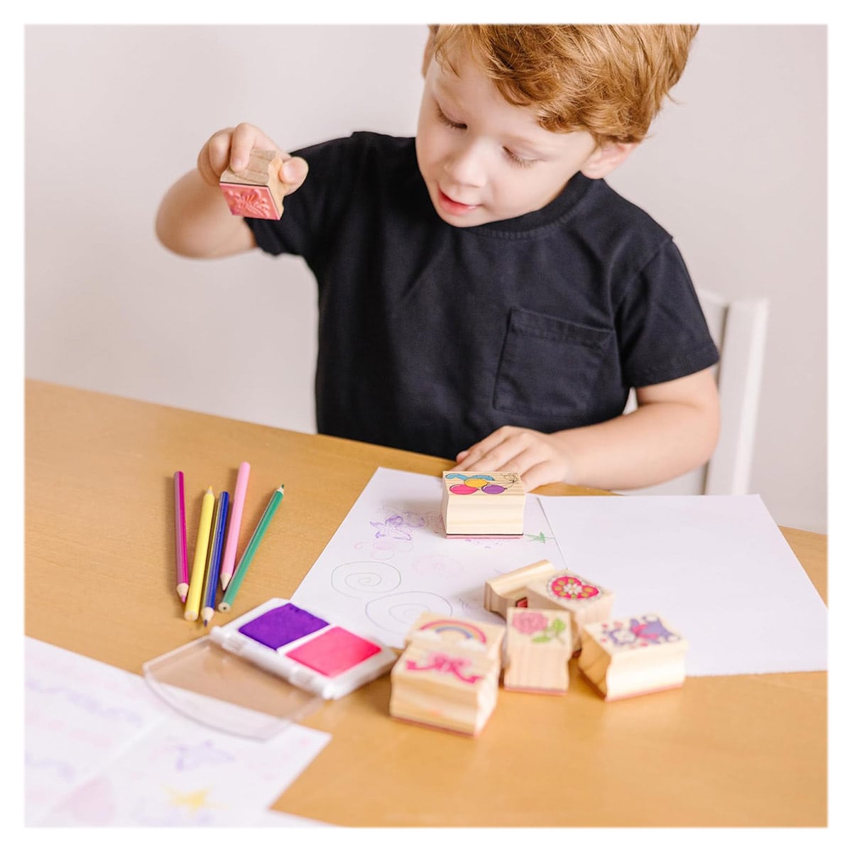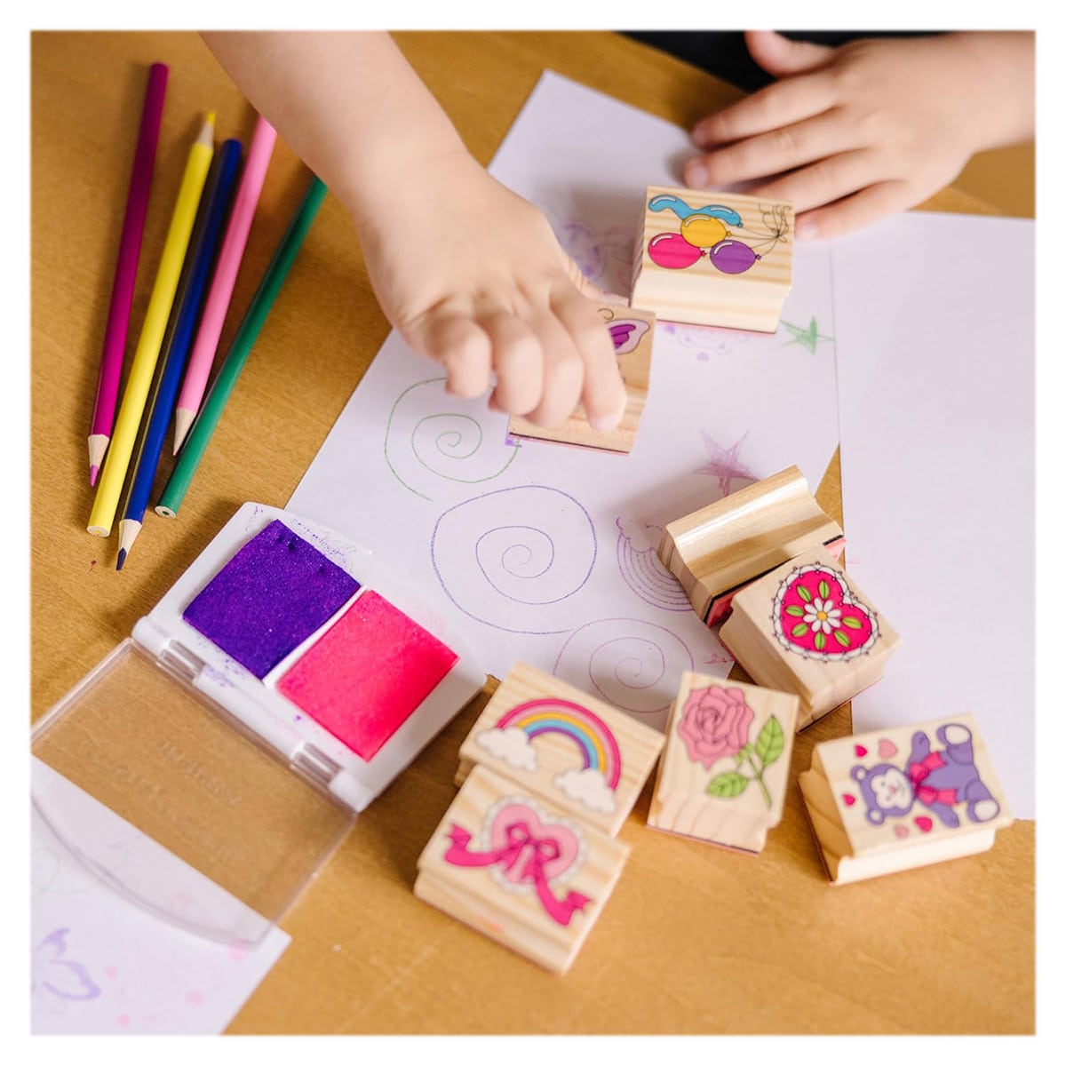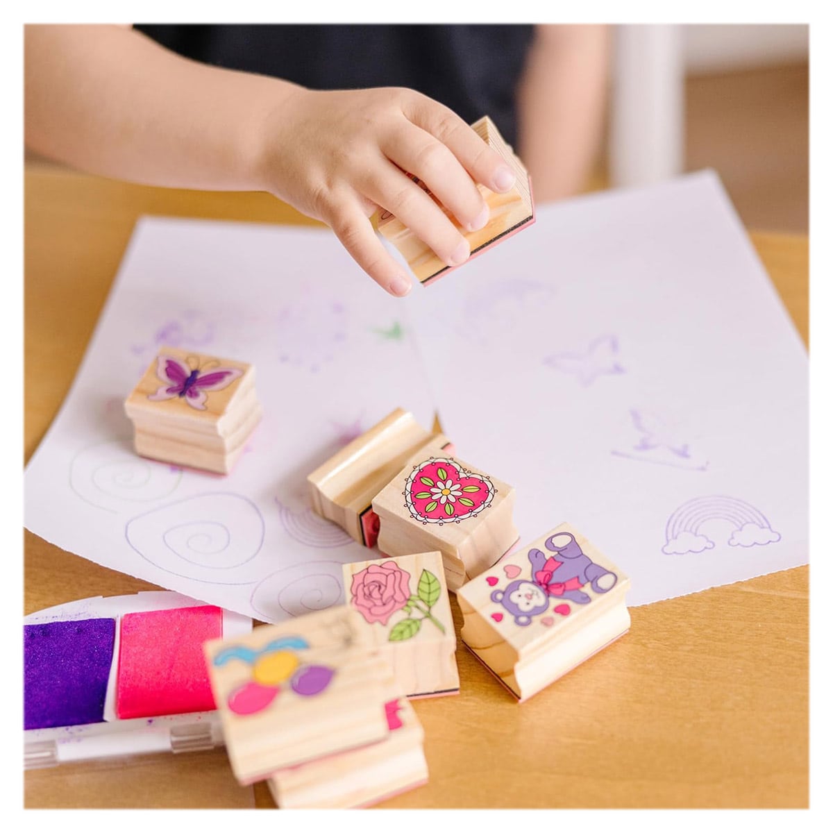 - A készlet tartalma: 9 különböző bélyegző, 1 marker két színben (lila és rózsaszín) és 5 színes ceruza, egy fatálca.