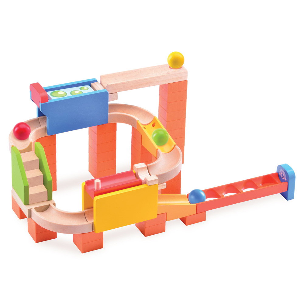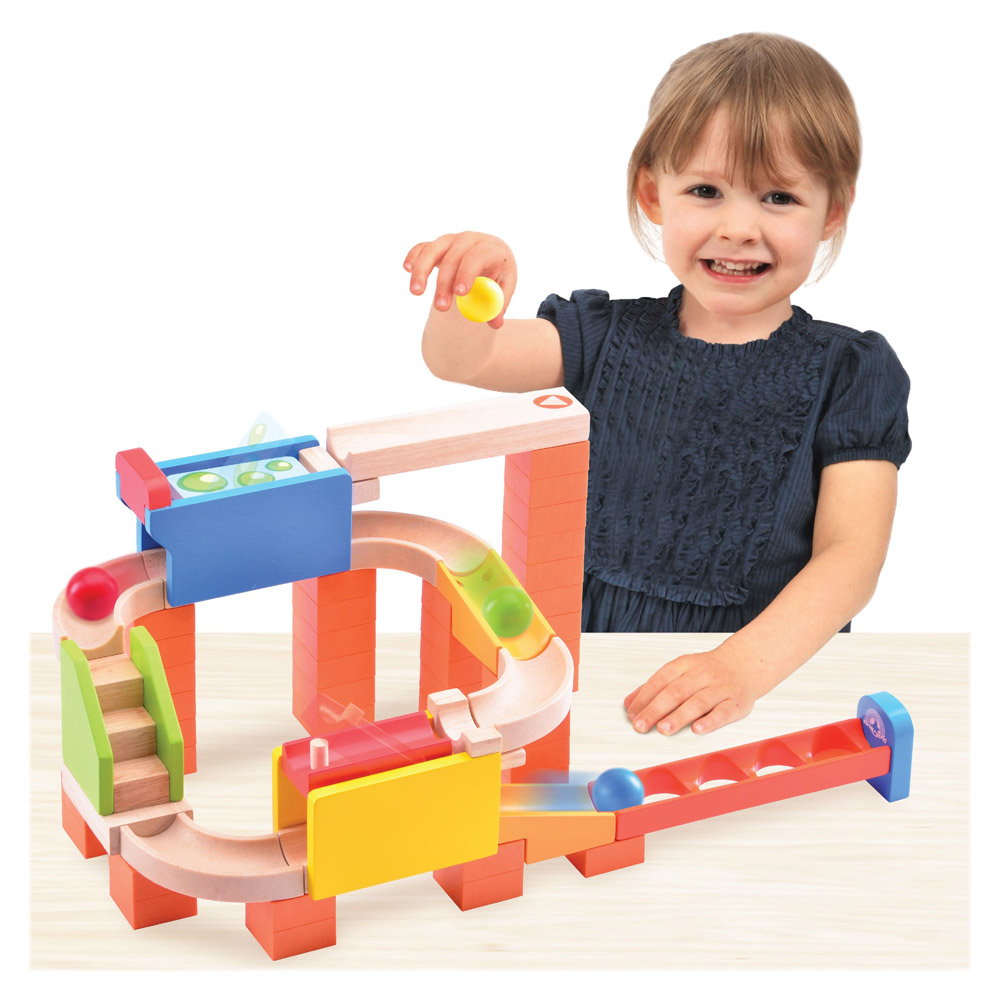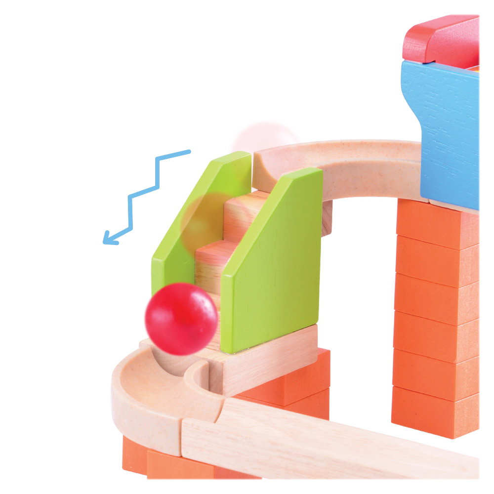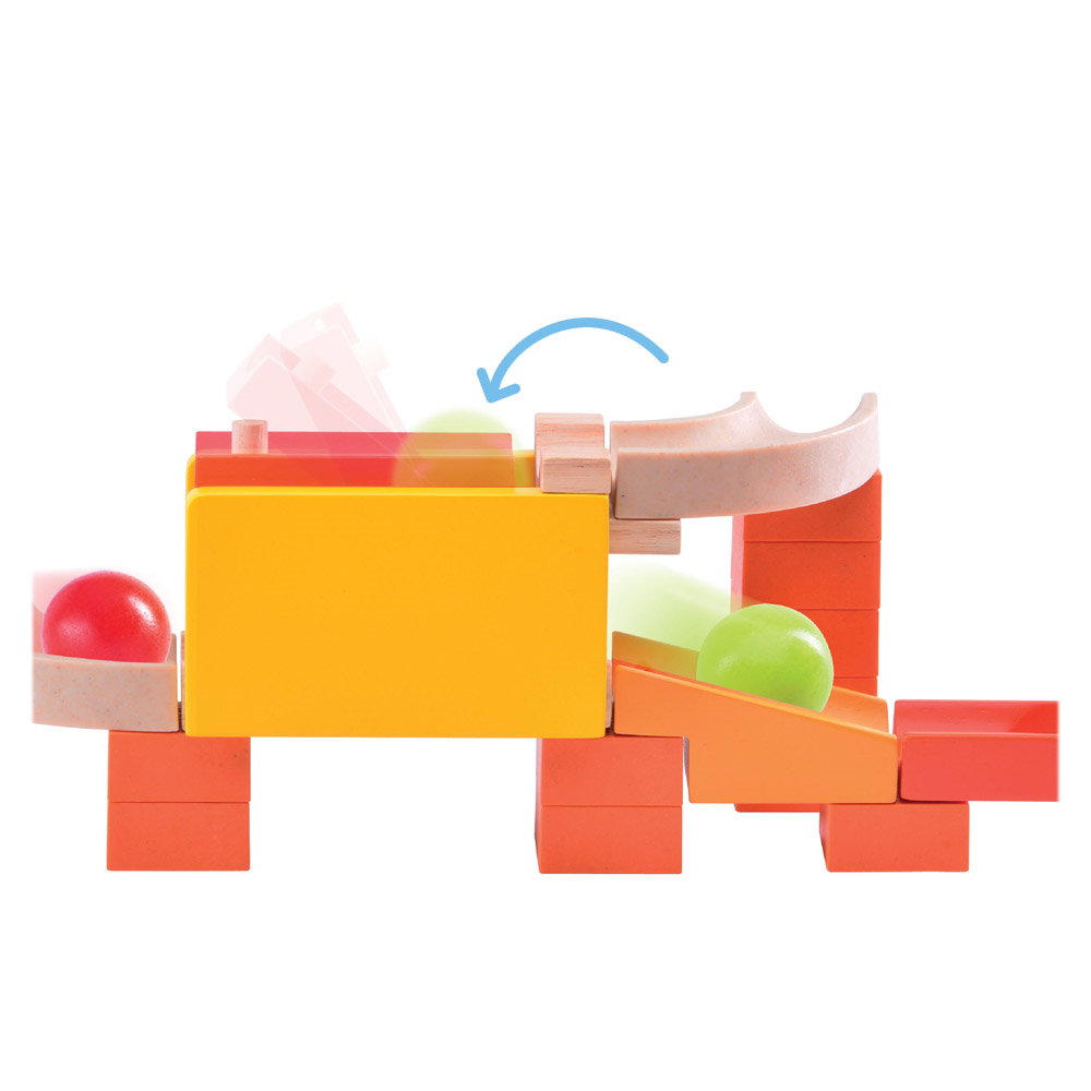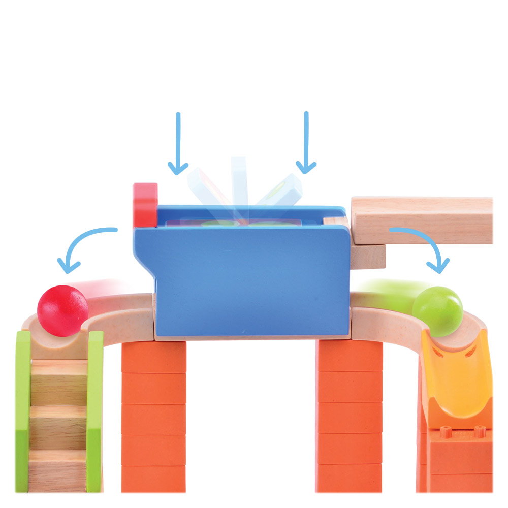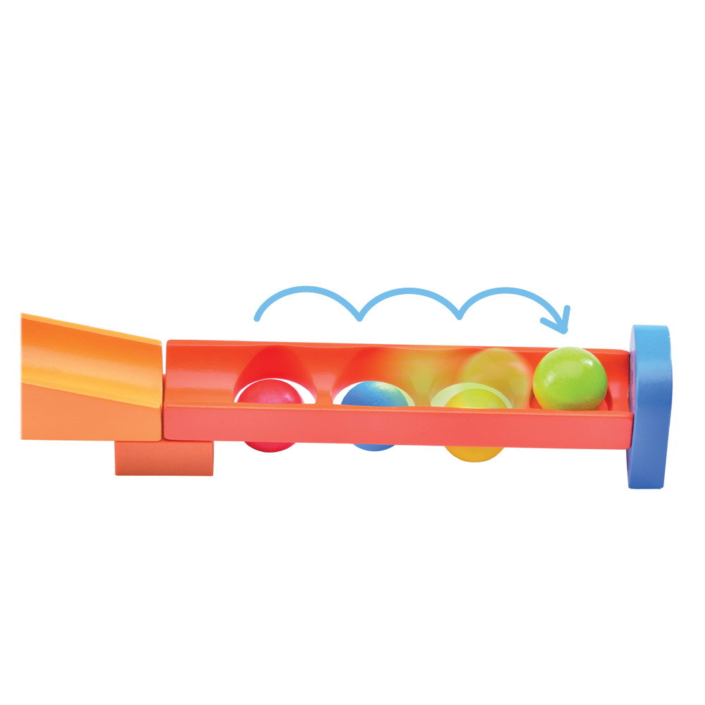 - Az összeszerelés után a gyermekek a pálya tetejére rakhatják a golyókat, melyek az általuk kialakított útvonalon haladnak a célig.
