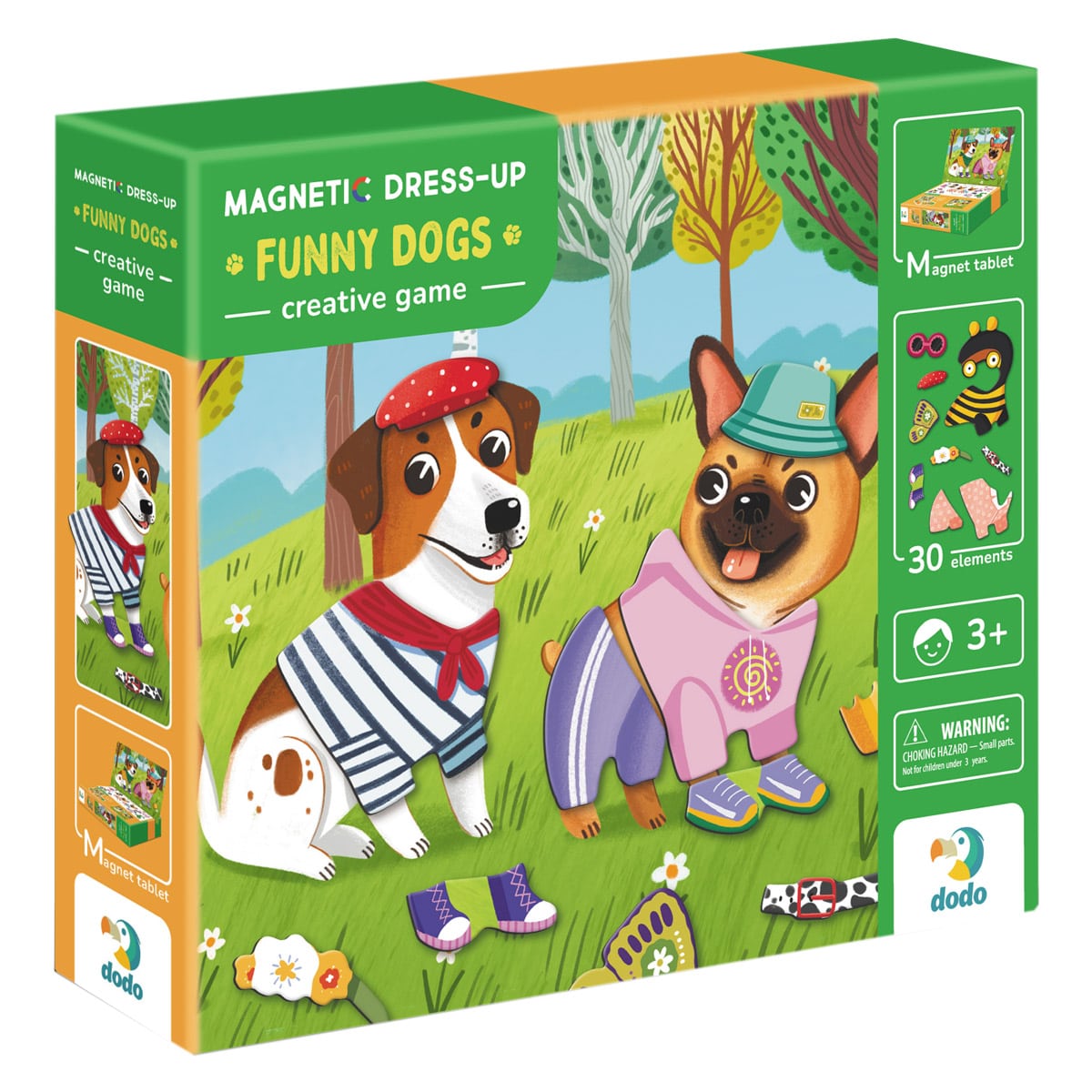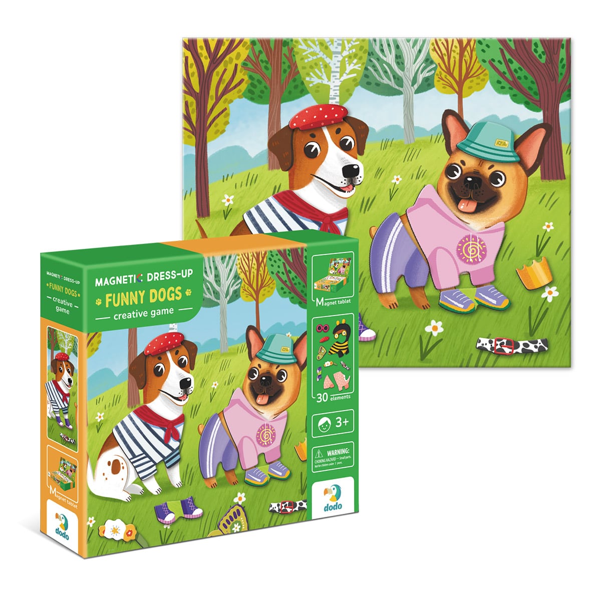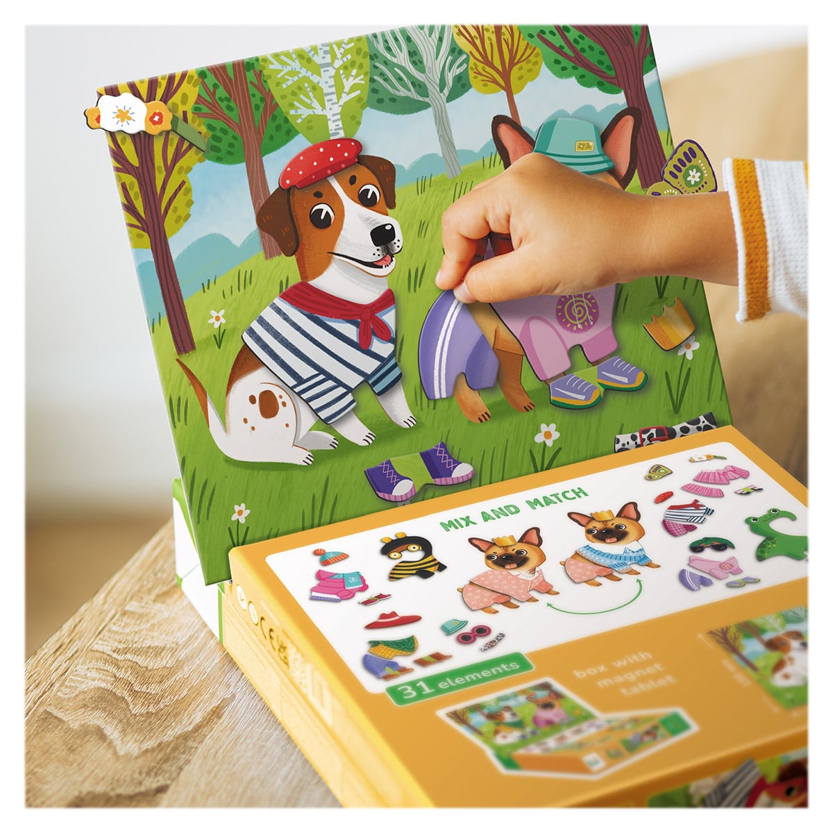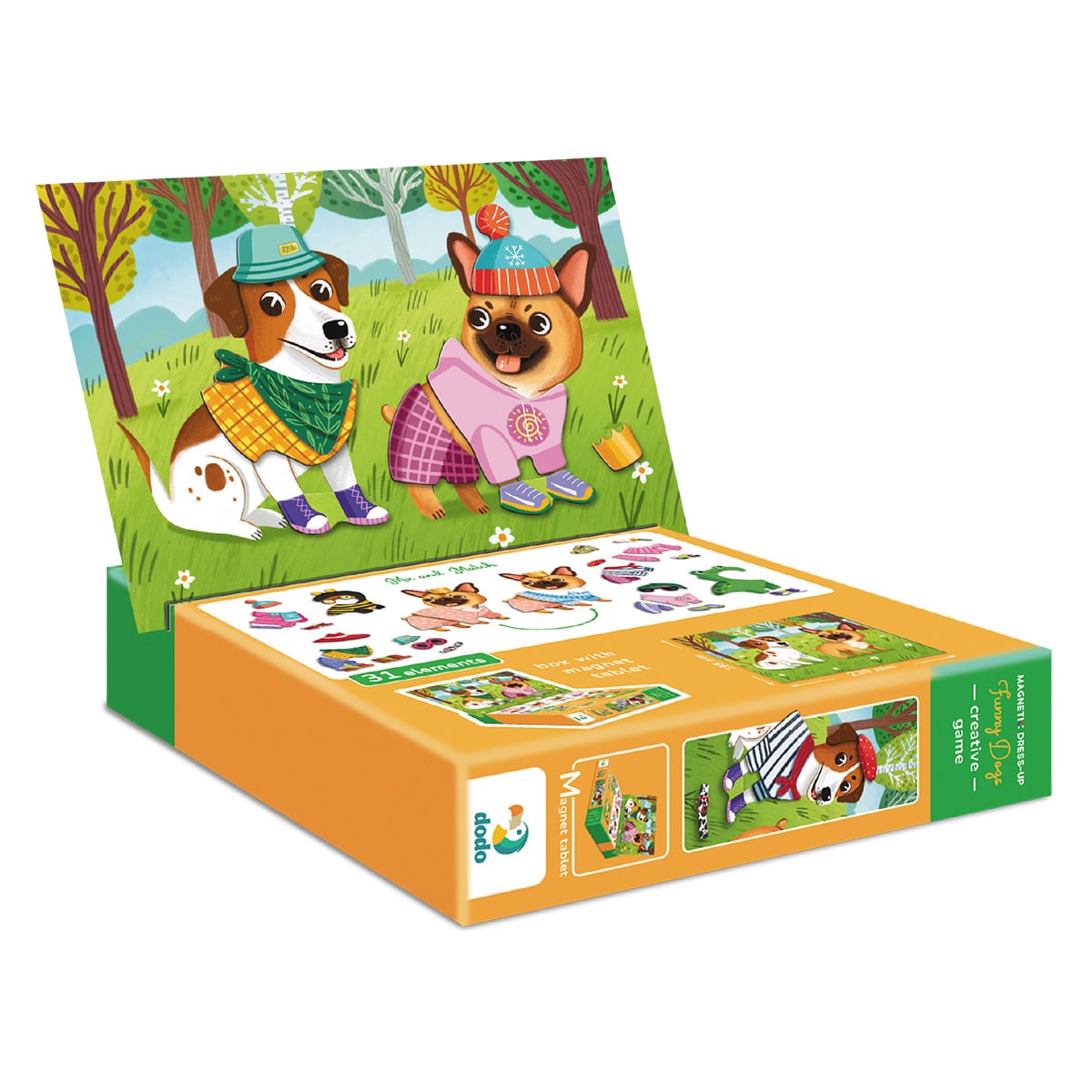 - Tartalma: 1 db mágneses tábla, 30 db mágnes ruha-, kiegészítő- és kutyaelemekkel