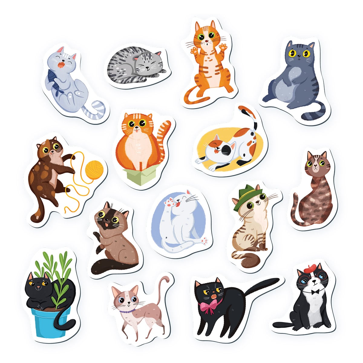 - A készlet 15 darab mágnest tartalmaz, cicákkal és kedvenc tevékenységeikkel.