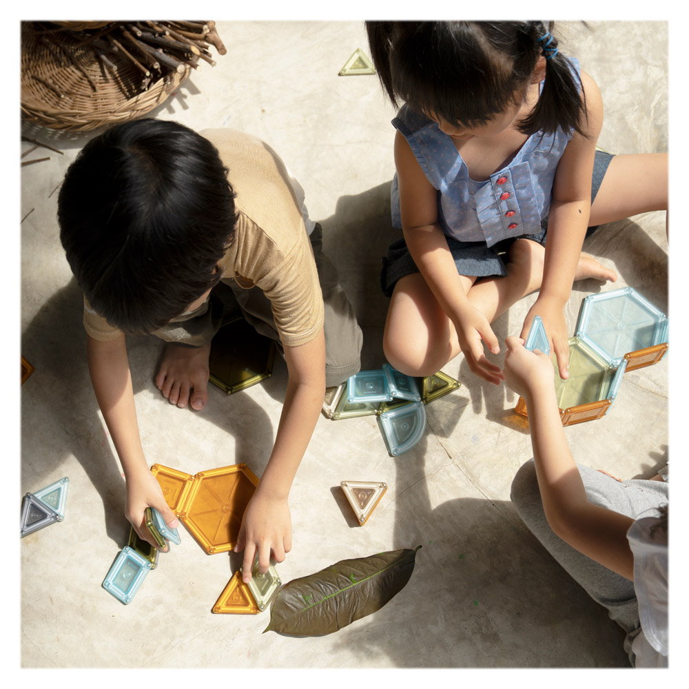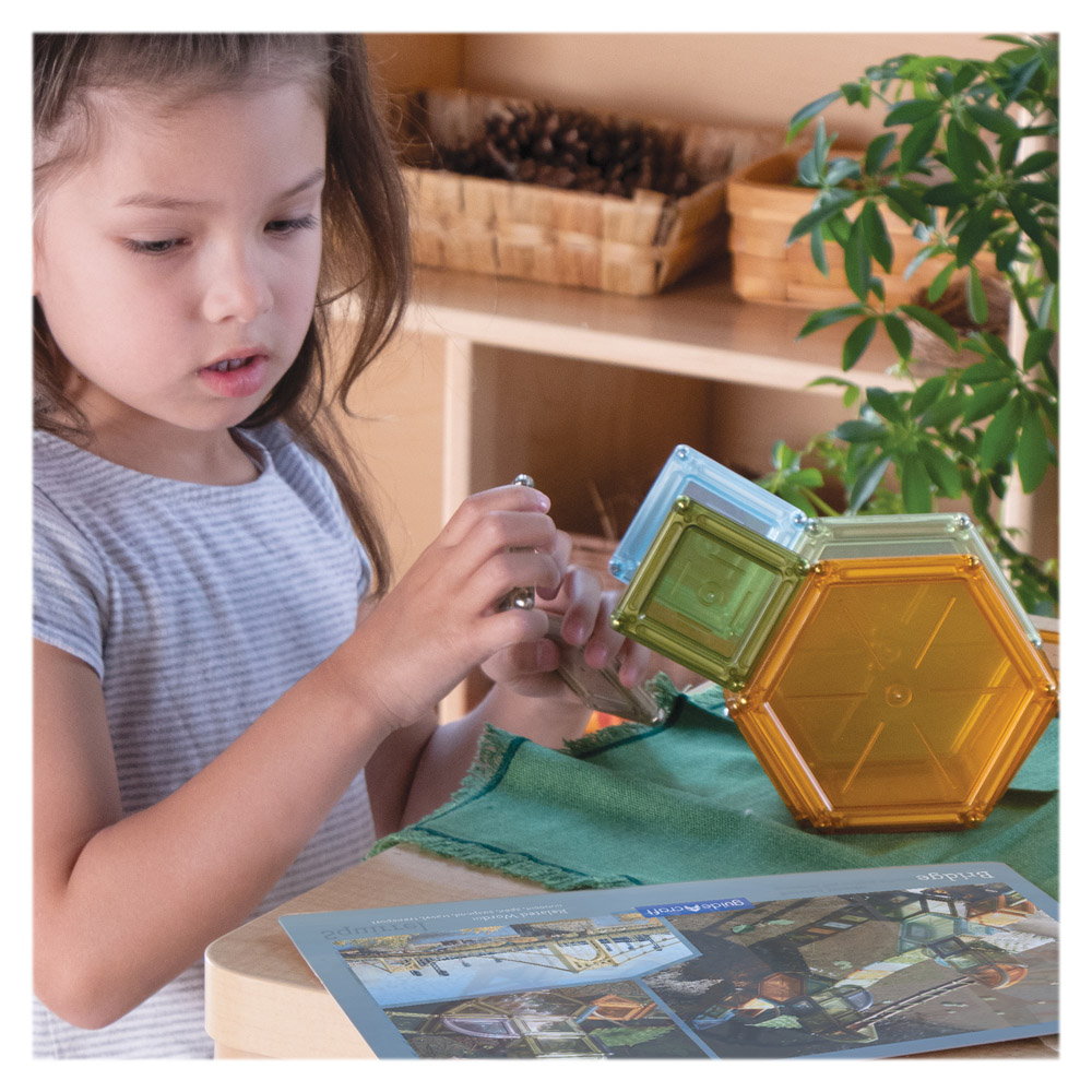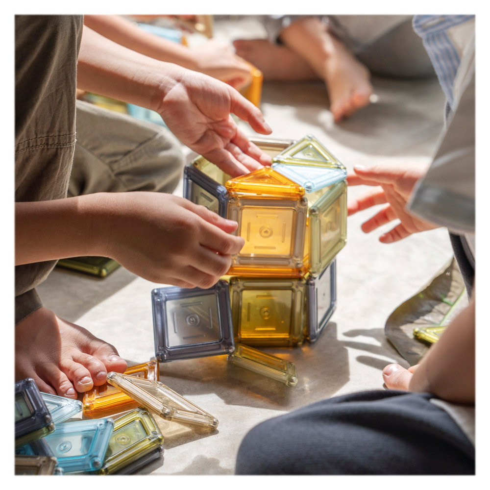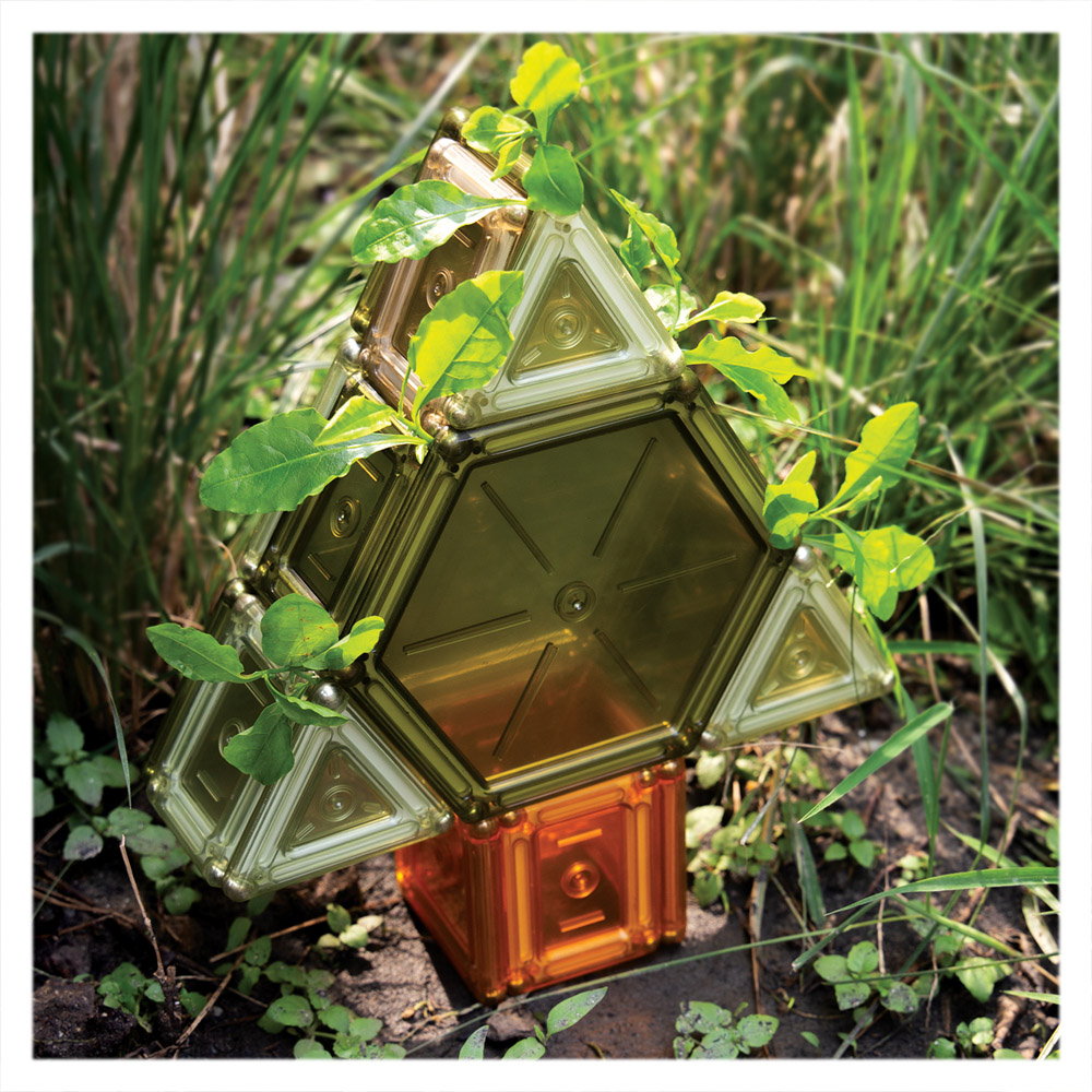 - Az alkatrészek áttetsző ABS műanyagból készülnek, beépített neodímium mágnesekkel. A gyerekek 2D-s és 3D-s építményeket készíthetnek a mágneses elemekkel.