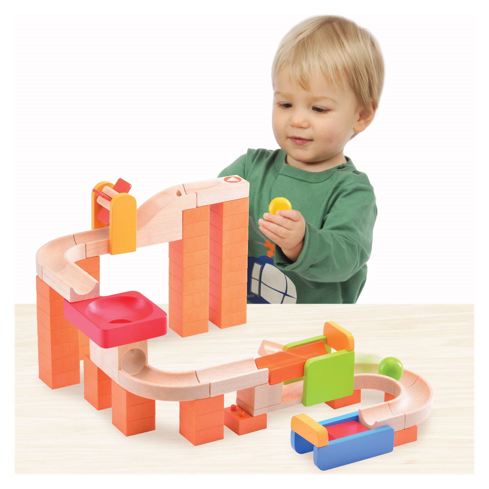 - A kicsik szívesen kötik össze a darabokat és építik az útvonalat, elengedik a golyót és nézik, ahogy gurul a cél felé.