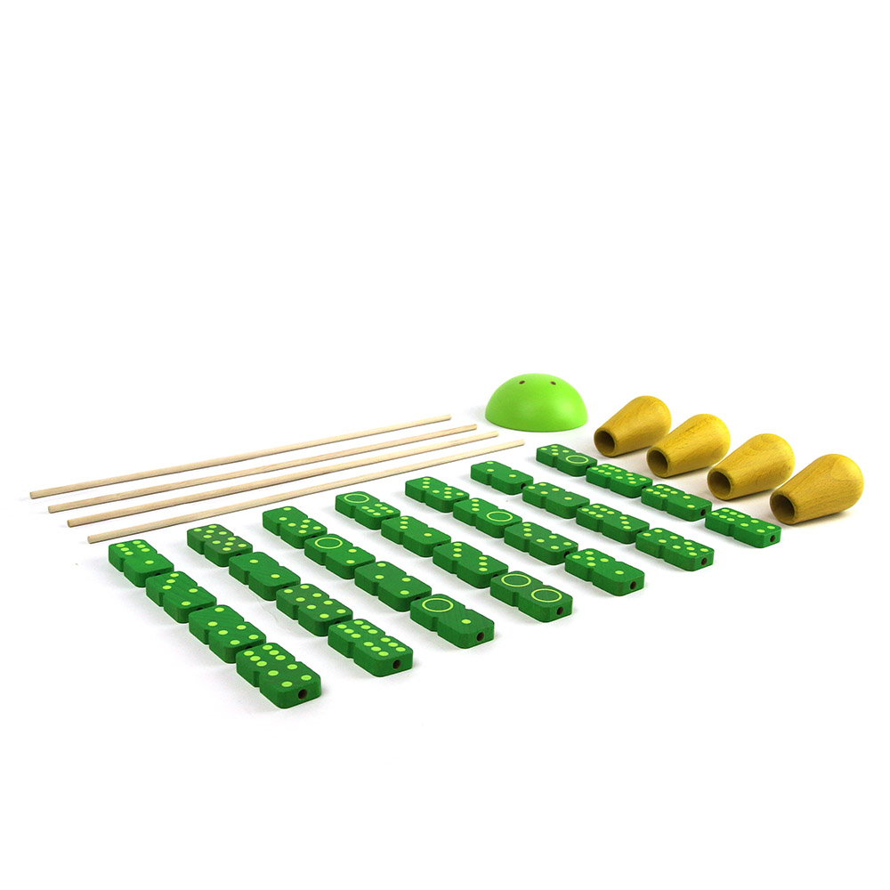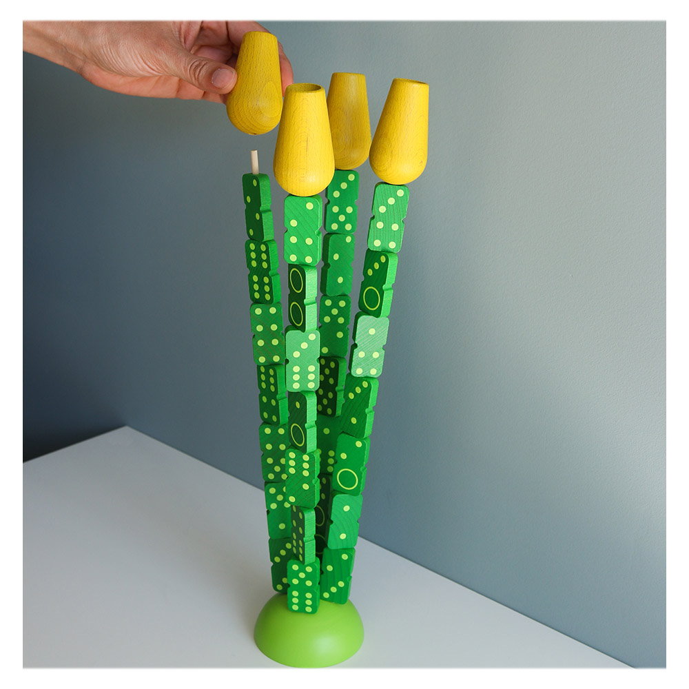 - A játék tartalma: 1 félgömb alakú alap (7 x 3 cm), 4 szár (31 cm), 28 dominó, 4 sárga virág.